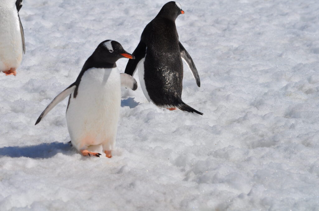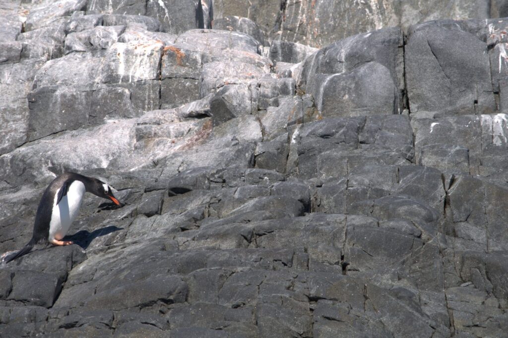 Approaching the rookery, I picked up the sound penguins make. It’s a sort of constant twittering or trilling that rises and falls in volume but never stops. I walked up to within about 15 feet of the rookery and stopped to watch a collection of at least 100 of what are known as Gentoo penguins. They are the most common species of penguins in this part of Antarctica. And, yes, they do look like they’re wearing tuxedos. They have bright white bellies, and very dark backs. Their beaks have an orange stripe on each side, and a small blaze of white surrounds each eye and wraps around on top of their heads. The wings of these flightless birds usually droop toward the ground until they walk, when the wings are extended, presumably for balance. Their webbed feet (they are good swimmers after all) are a light orange with what look like dark nails. A short tail protrudes from their lower backs. And, yes, as many of us have seen in documentaries, they have the most peculiar walk. They teeter from side to side and lean slightly forward. Watching, I understood why the guides had warned us against touching them. They are adorable.