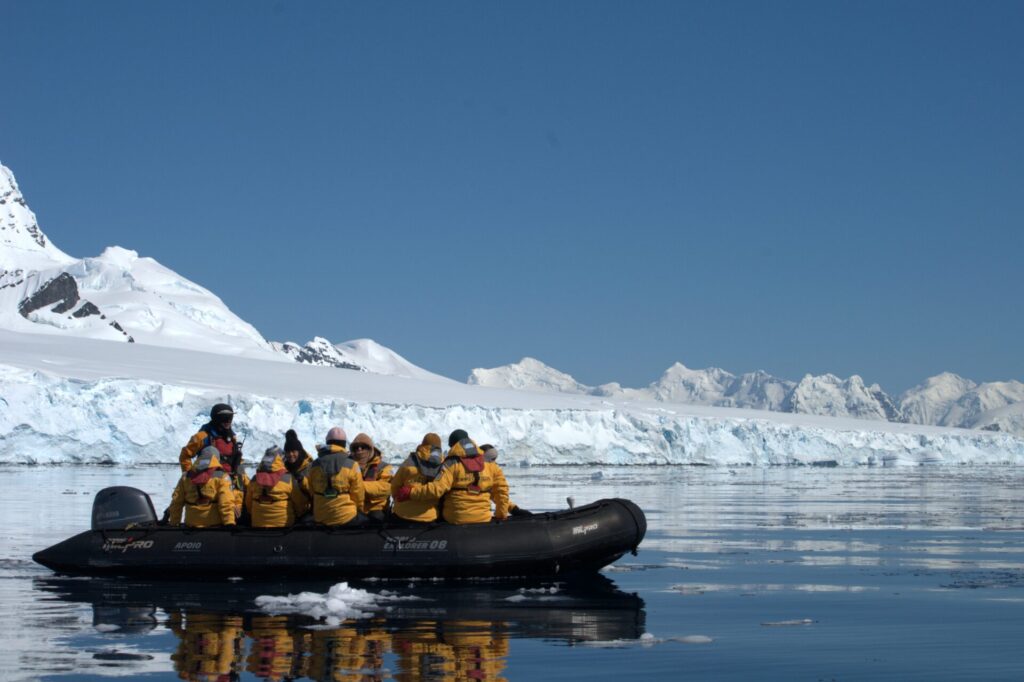 Once we felt ready, we ambled down a hallway to a tunnel that led to our departure area. Quark workers checked our readiness and tugged on lifejackets to make sure they were tightly strapped. Often, guides played music to help us get ready as we marched toward a door that led down steps to the water. As a last step, we walked through a machine with rotating brushes and disinfectants that removed any contaminants from boots. We didn’t want to introduce germs, viruses, or other pathogens onto Antarctic land or to the wildlife there—with special attention paid to avoid introducing avian flu.