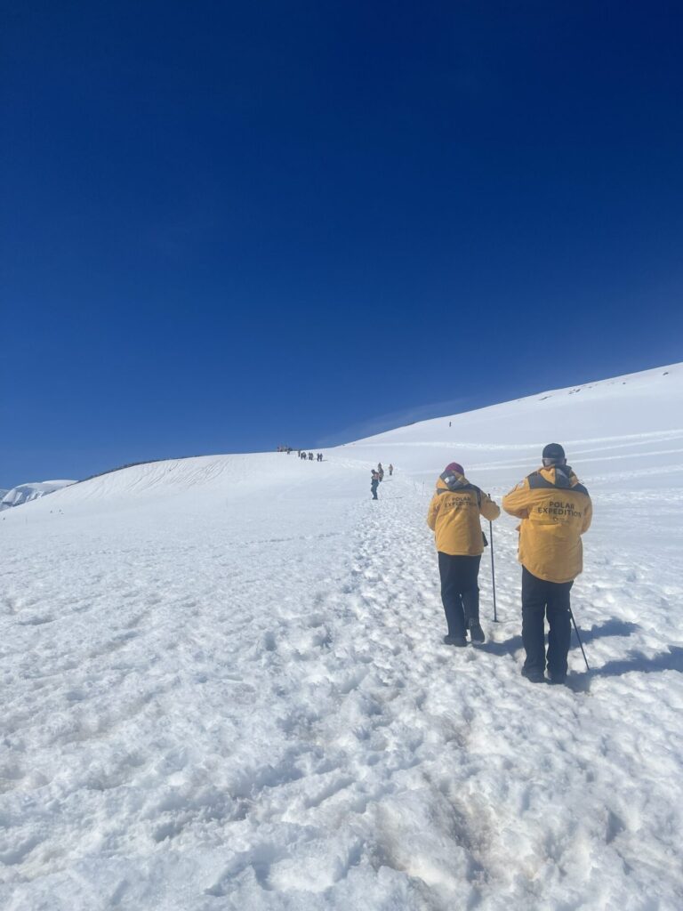 Once we gathered as a group after landing, the guides gave us final instructions, including a reminder to stay at least 15 feet from penguins. These cute creatures also had the “right of way” on the many paths between rookeries and the water. “And please, please, don’t ever touch or pick them up even if they walk right up to you,” one guide cautioned. They also reminded us that, to prevent contamination, we should never sit down or place anything on the surface. Instead, they gave us poles to help us walk on the crunchy white surface. But we couldn’t even place those poles lengthwise on the ground. The guides did lay a tarp on the surface, where we could temporarily drop our knapsacks and life jackets